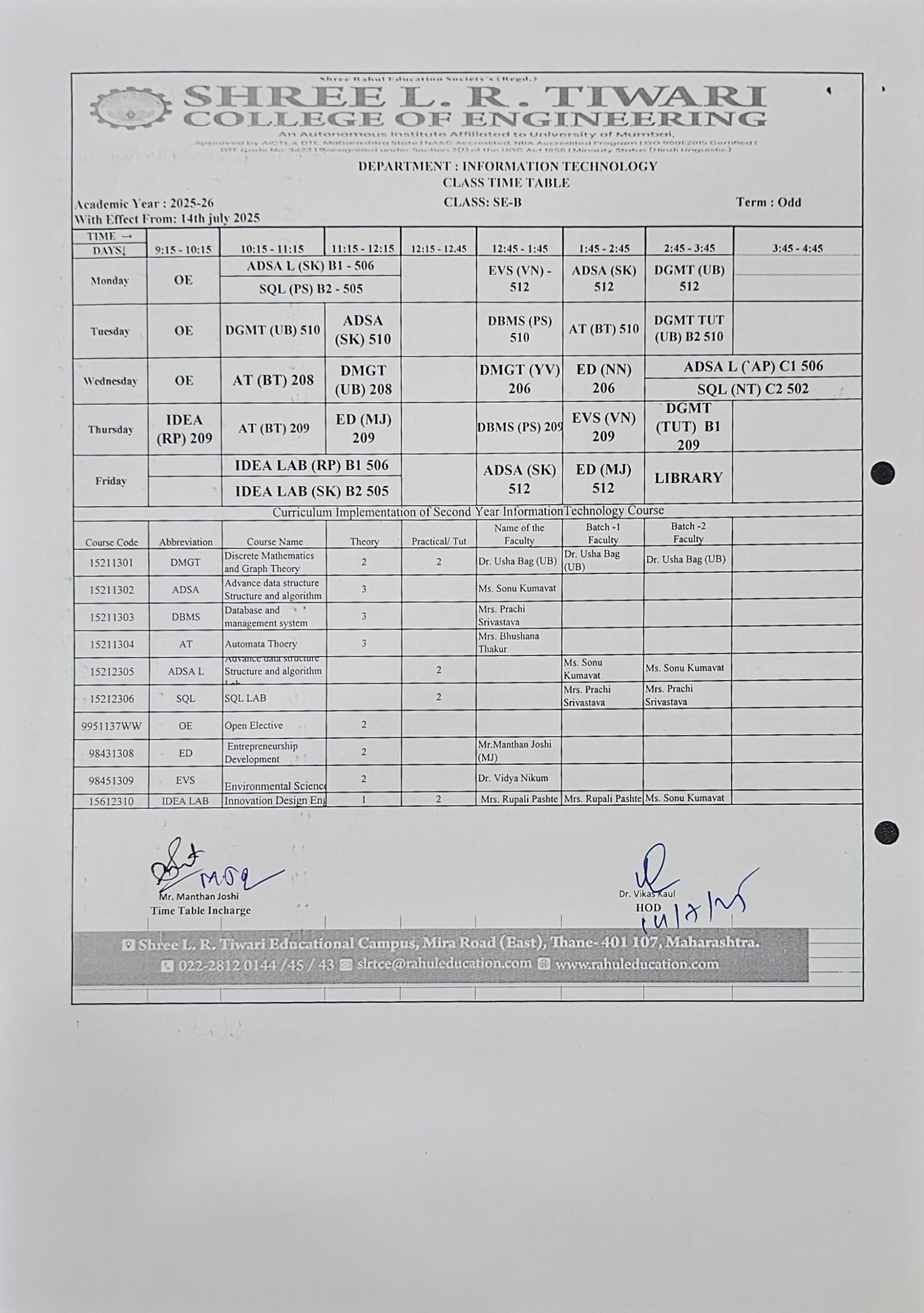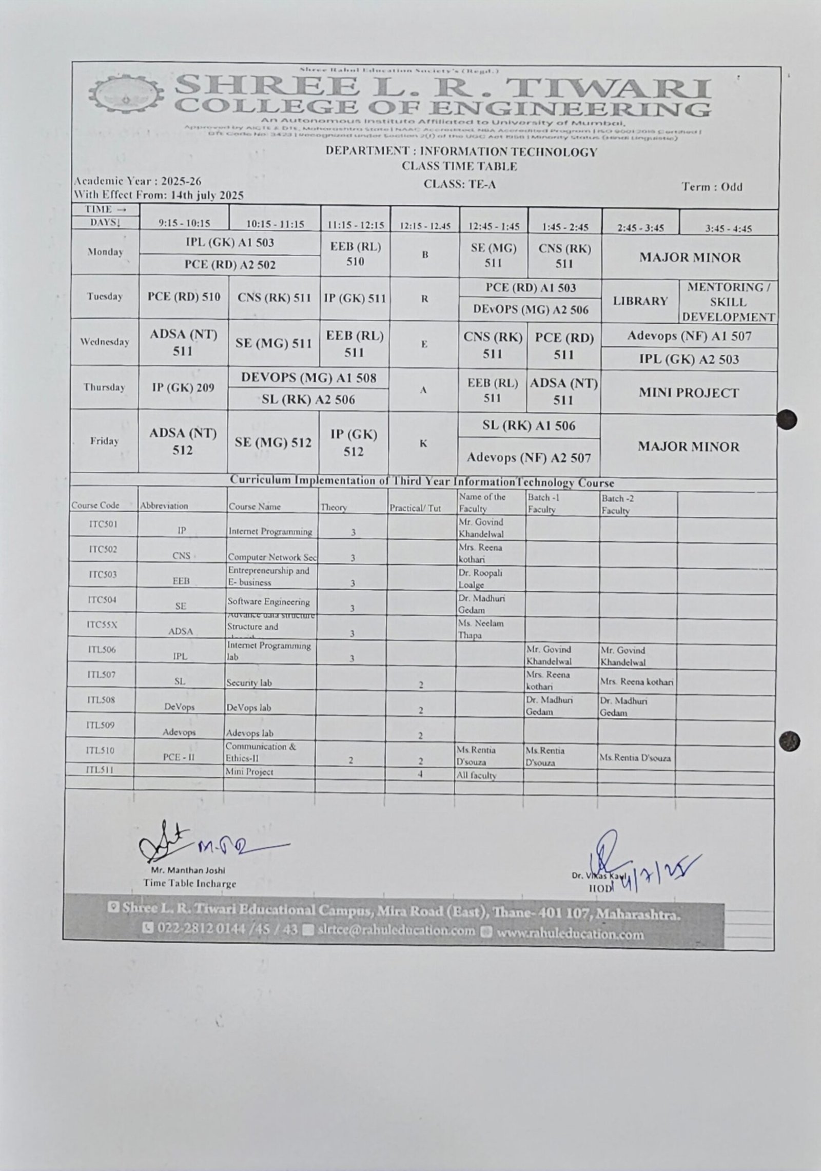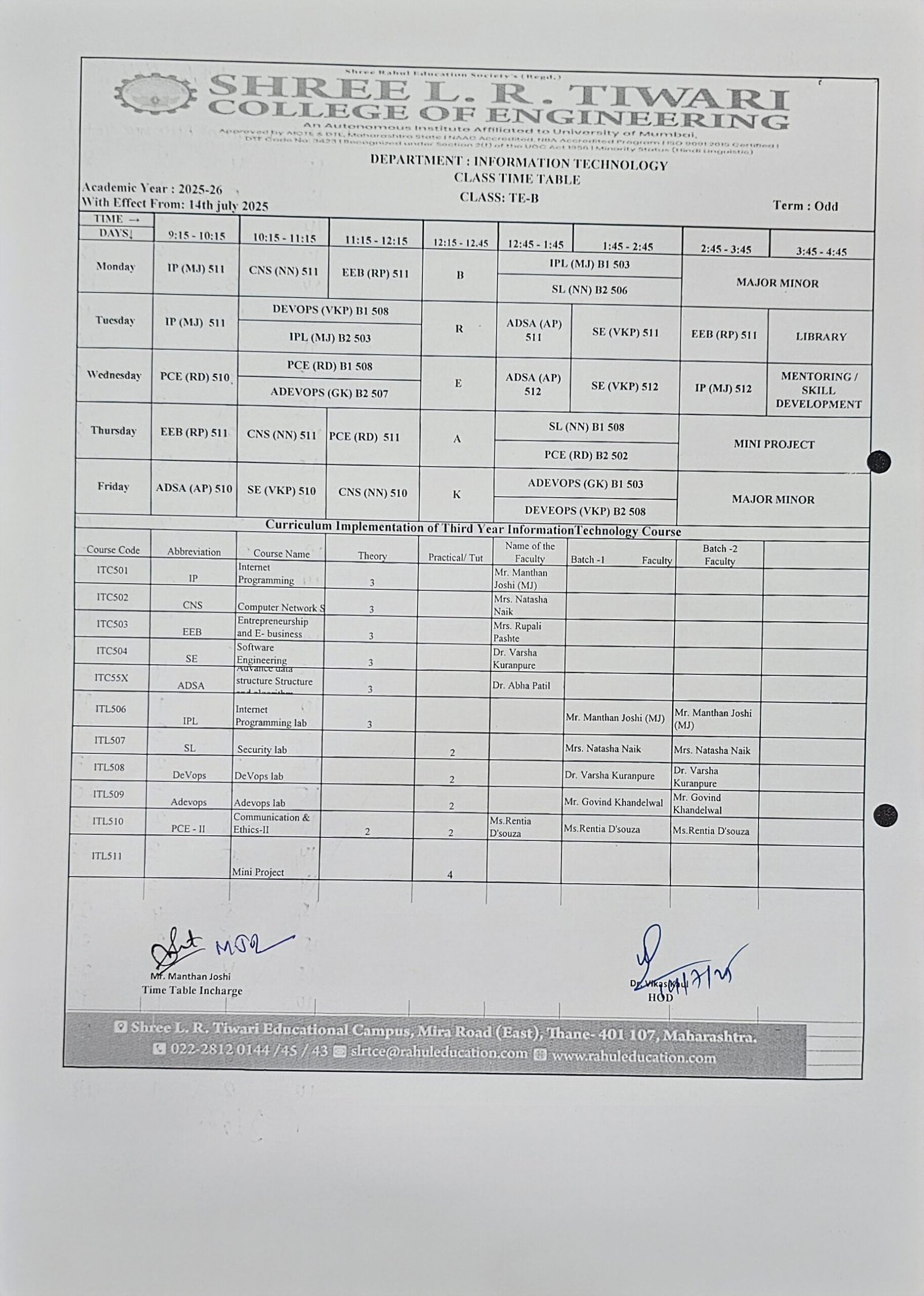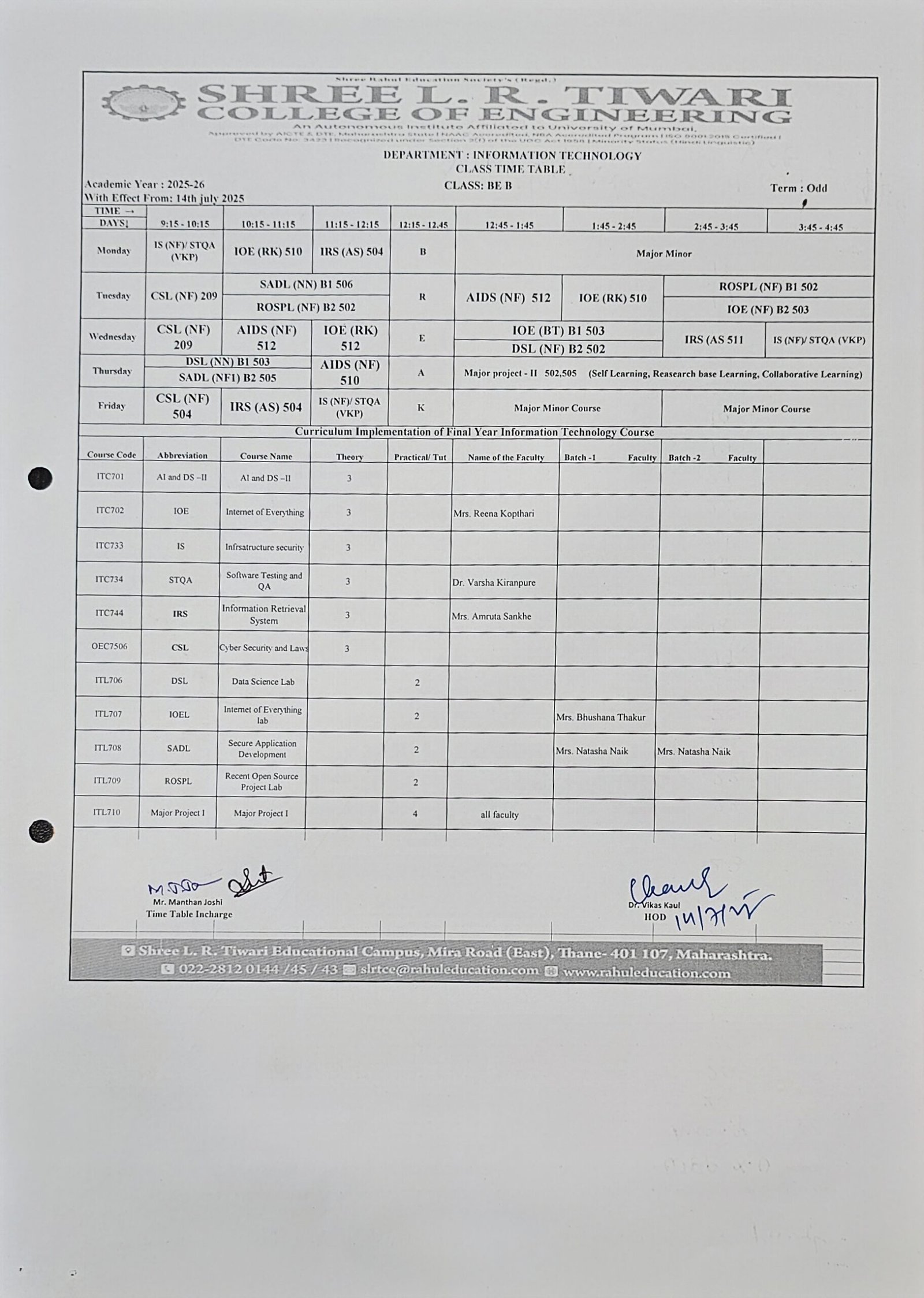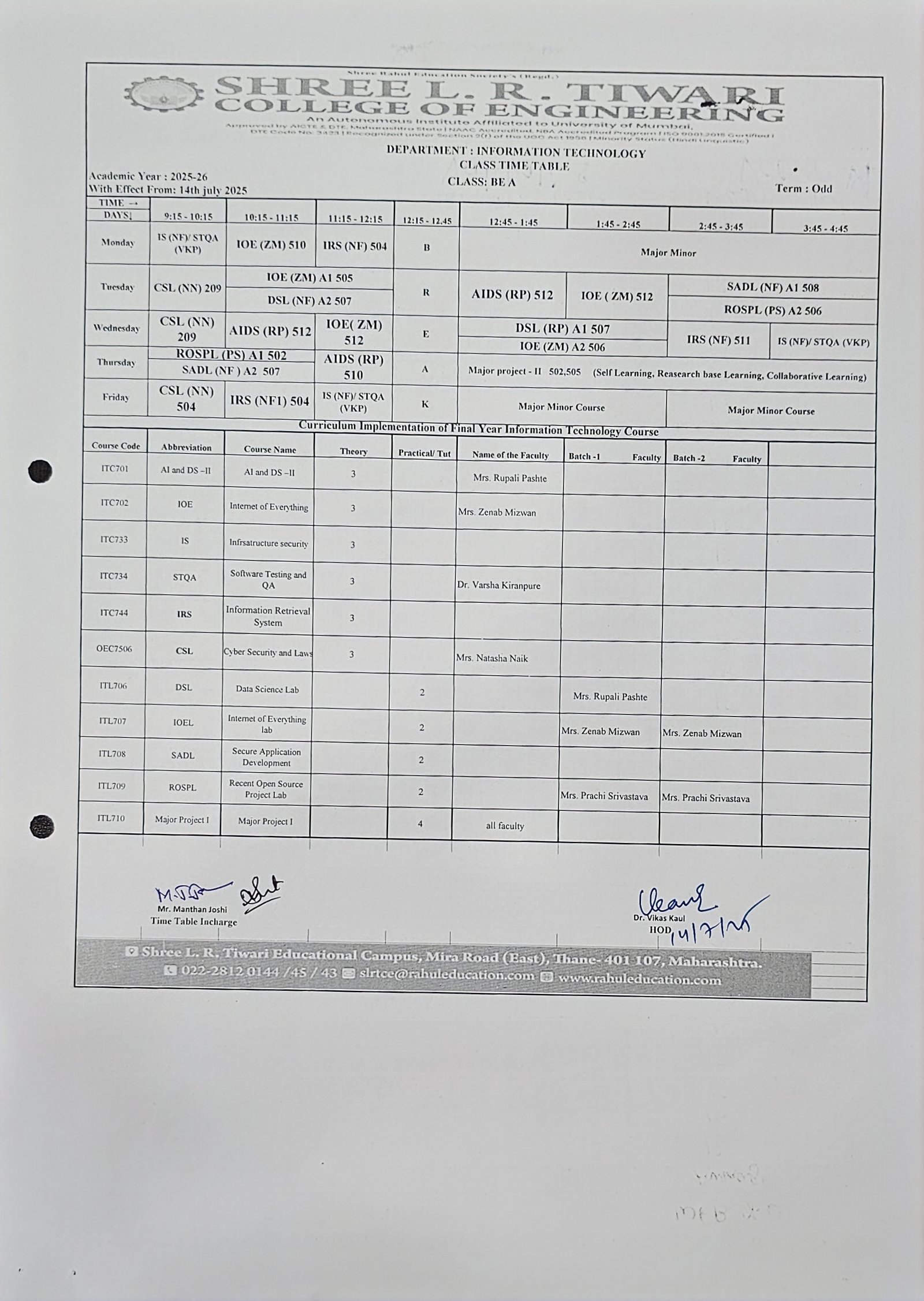 Keeping track of your academic schedule is crucial for a successful learning experience. The Information Technology Department at Shree L. R. Tiwari College of Engineering is pleased to provide you with our up-to-date timetable, designed to help you stay organized and make the most of your educational journey.